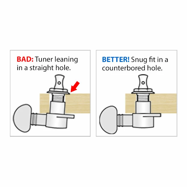The collar on a sealed tuner’s housing has a larger diameter than the threaded peghead bushing. Under string tension, the installed bushing (and the peghead washer) can lean slightly in a constant-diameter peghole. This can damage the lacquer finish around the bushing washer. A peghole that’s properly sized for the bushing, and rear-counterbored for the housing collar, prevents the problem.