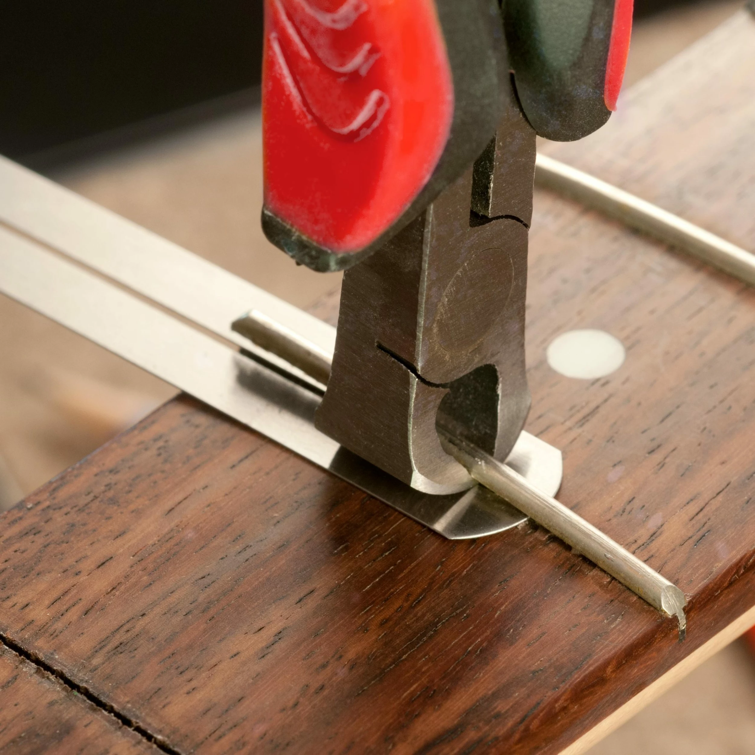 Now lift the end of the fret, getting under it with the jaws of the Fret Puller. As soon as it starts coming out, slide the Chip Stopper into place; the .033″ x 3″ slot fits around the fret tang. Now you can walk the Fret Puller down the length of the fret, lifting it out as the Stopper protects the wood underneath.