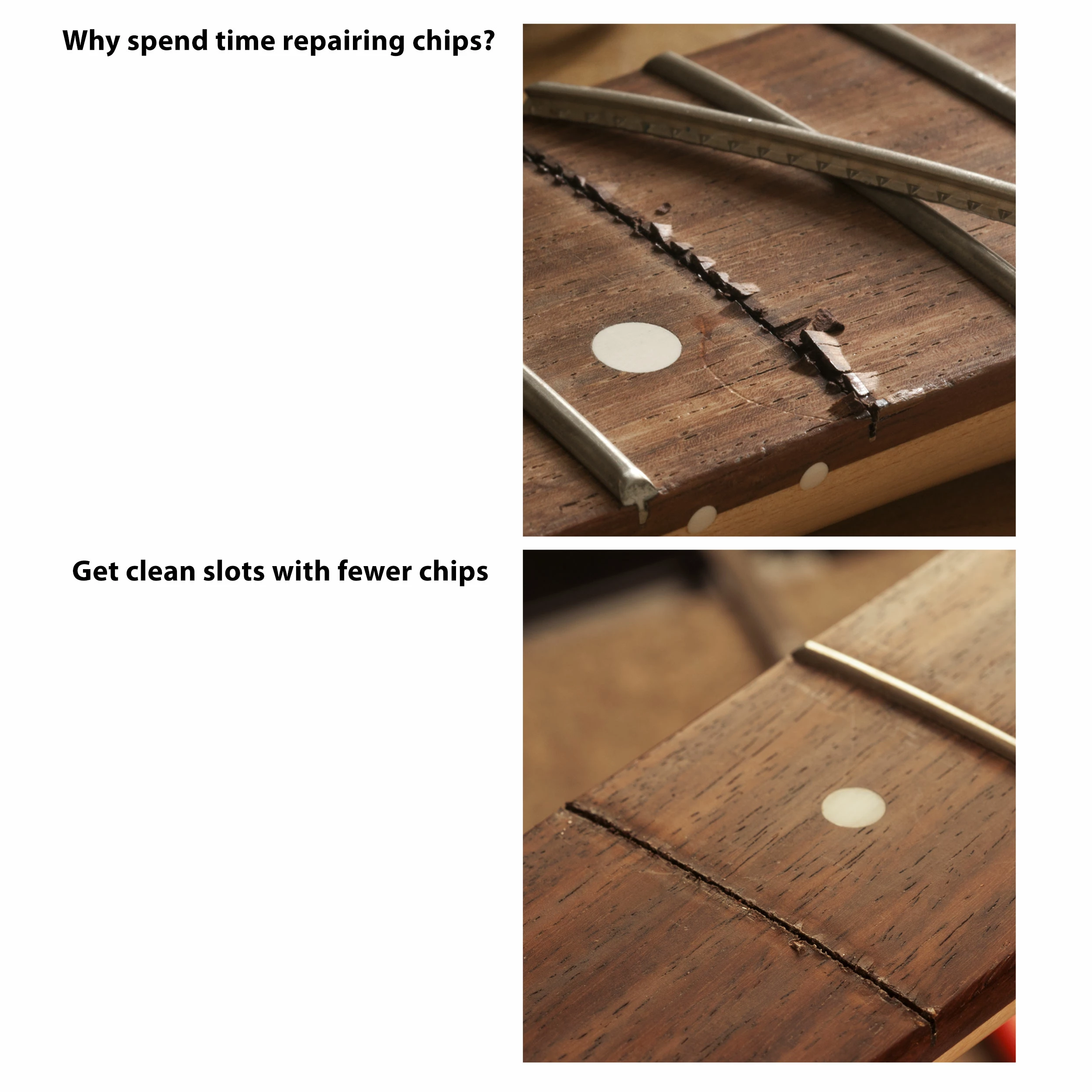 Fewer chips, cleaner refrets, less work. Tired of gluing back fingerboard chips after pulling up old frets? Our steel Chip Stoppers™ work with our Fret Puller to minimize chip-out.