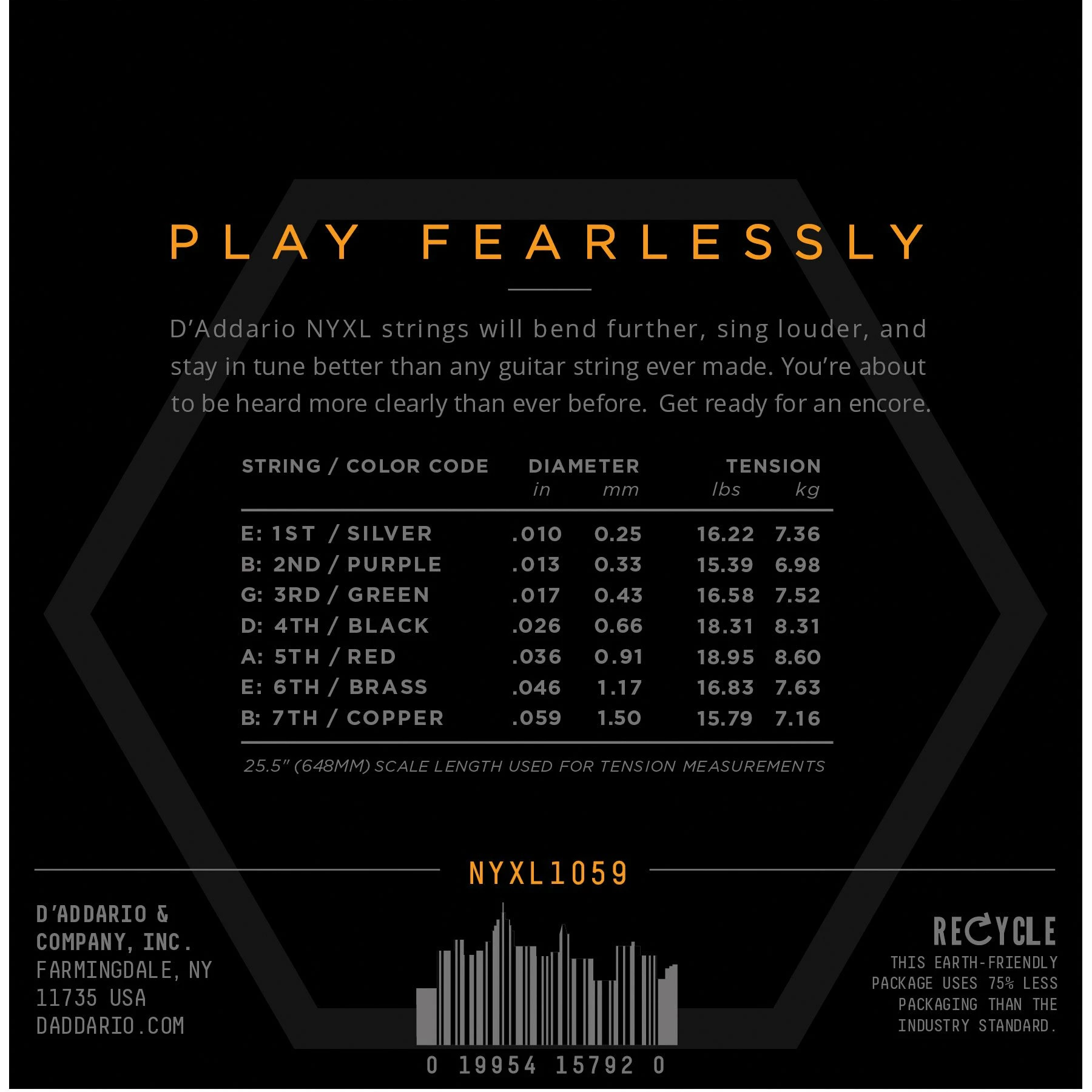 Envisioned, perfected, and manufactured by D’Addario in New York, this newly engineered, break-resistant, high-carbon steel core and plain steel alloy delivers a whole new level of freedom, confidence, and power. NYXL’s provide more strength and up to 131% greater tuning stability by utilizing a completely reinvented wire drawing process coupled with a revolutionary “fusion twist” process for the plain steels. The reformulated nickel plated string windings have greater magnetic properties resulting in higher output and enhanced mid-range frequency response for more presence and crunch.
