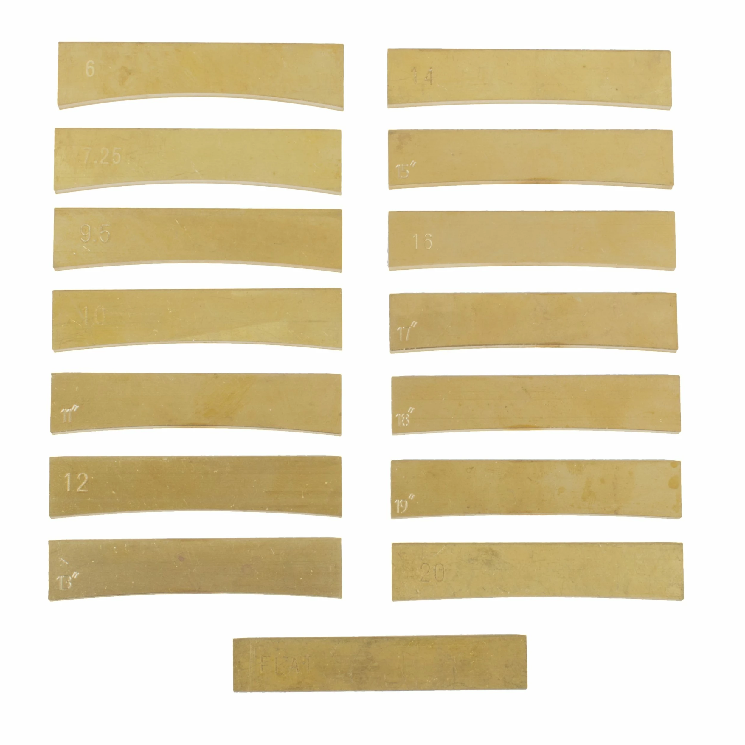 These 2-1/2″-wide grooved brass caul inserts fit our fret pressing tools and are designed for working with radiused or flat fretboards.