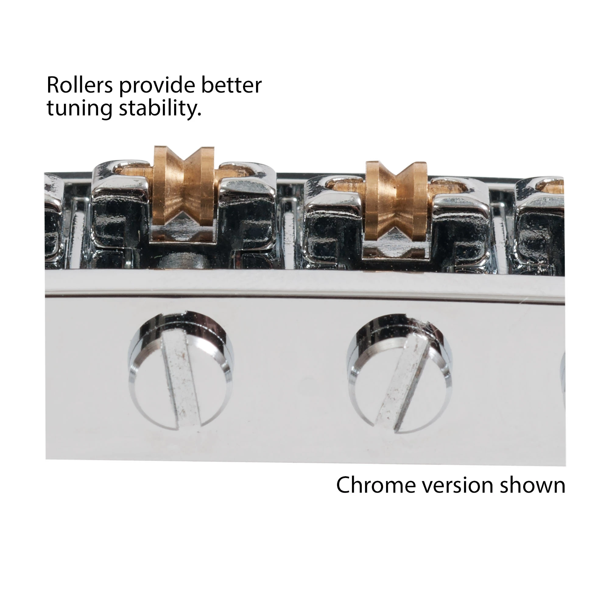 The only roller bridge that matches the 12″ radius of the Nashville Tune-O-Matic. Low-friction brass roller saddles let the strings move freely and return to accurate pitch.