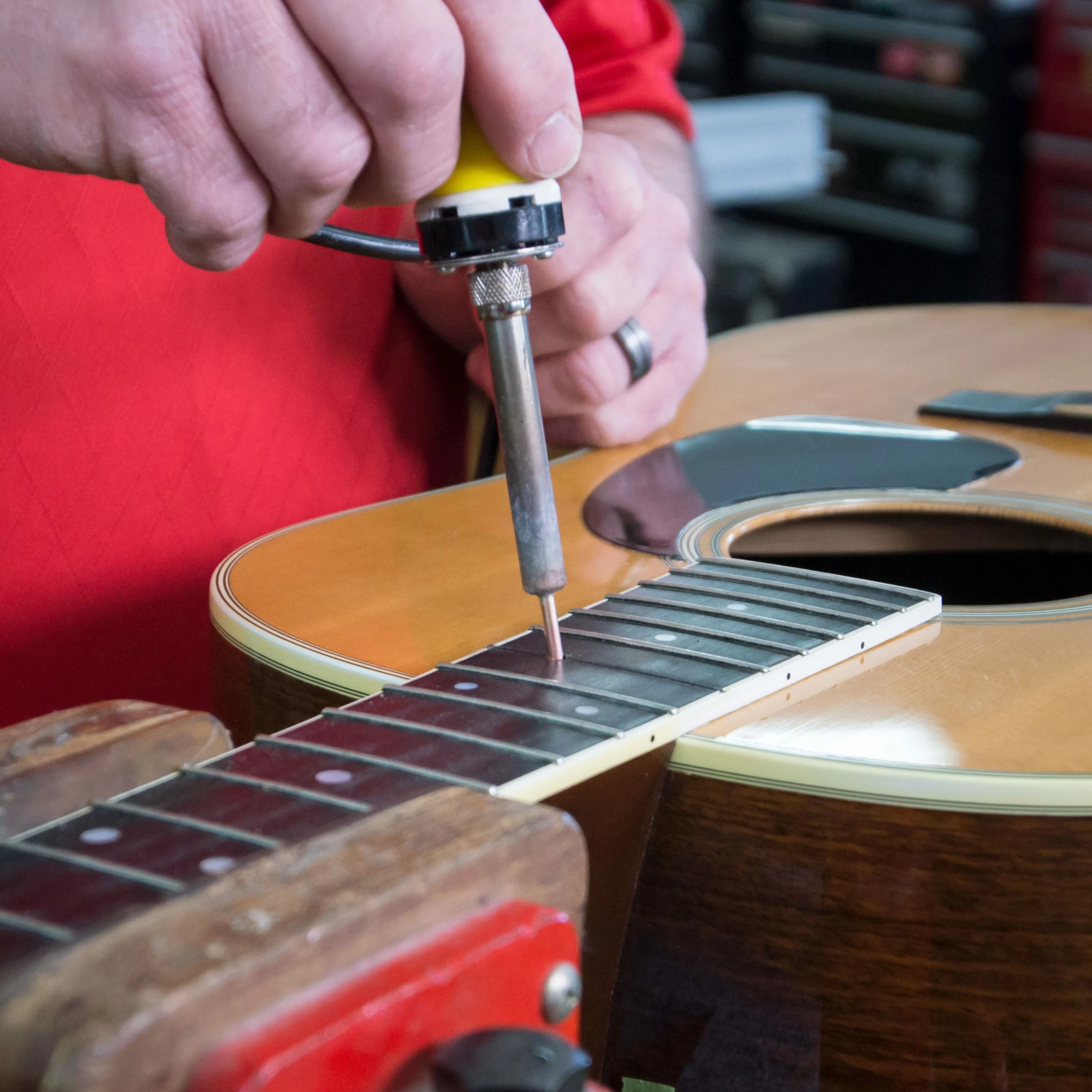 The revolutionary HeatStick softens glue without blushing delicate finishes or loosening the neck block or braces like steam can. It’s easy to control, and can be used for acoustic and electric guitars and mandolins. The HeatStick is 6″ of solid copper and includes two bits for drilling the pilot and access holes through the fretboard.