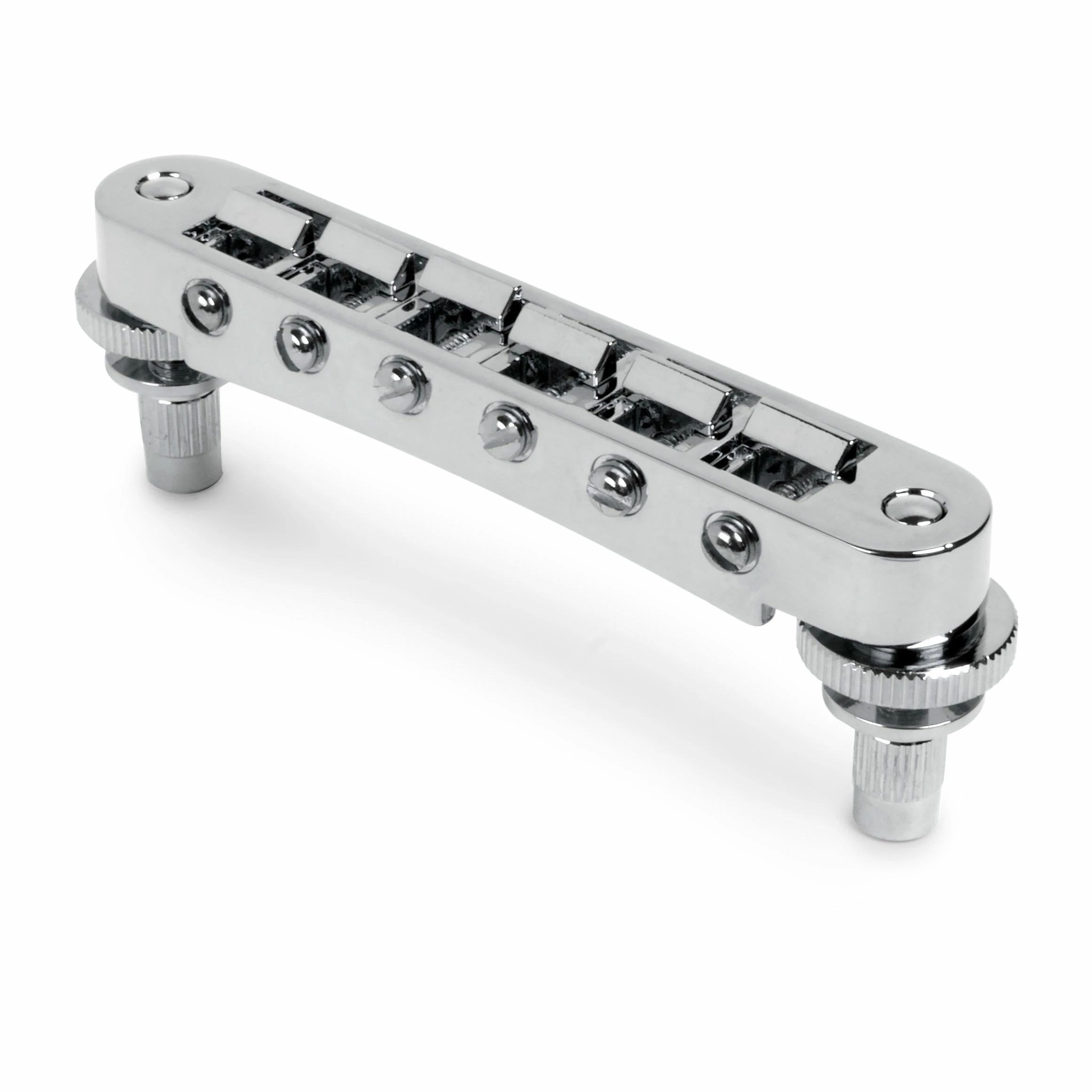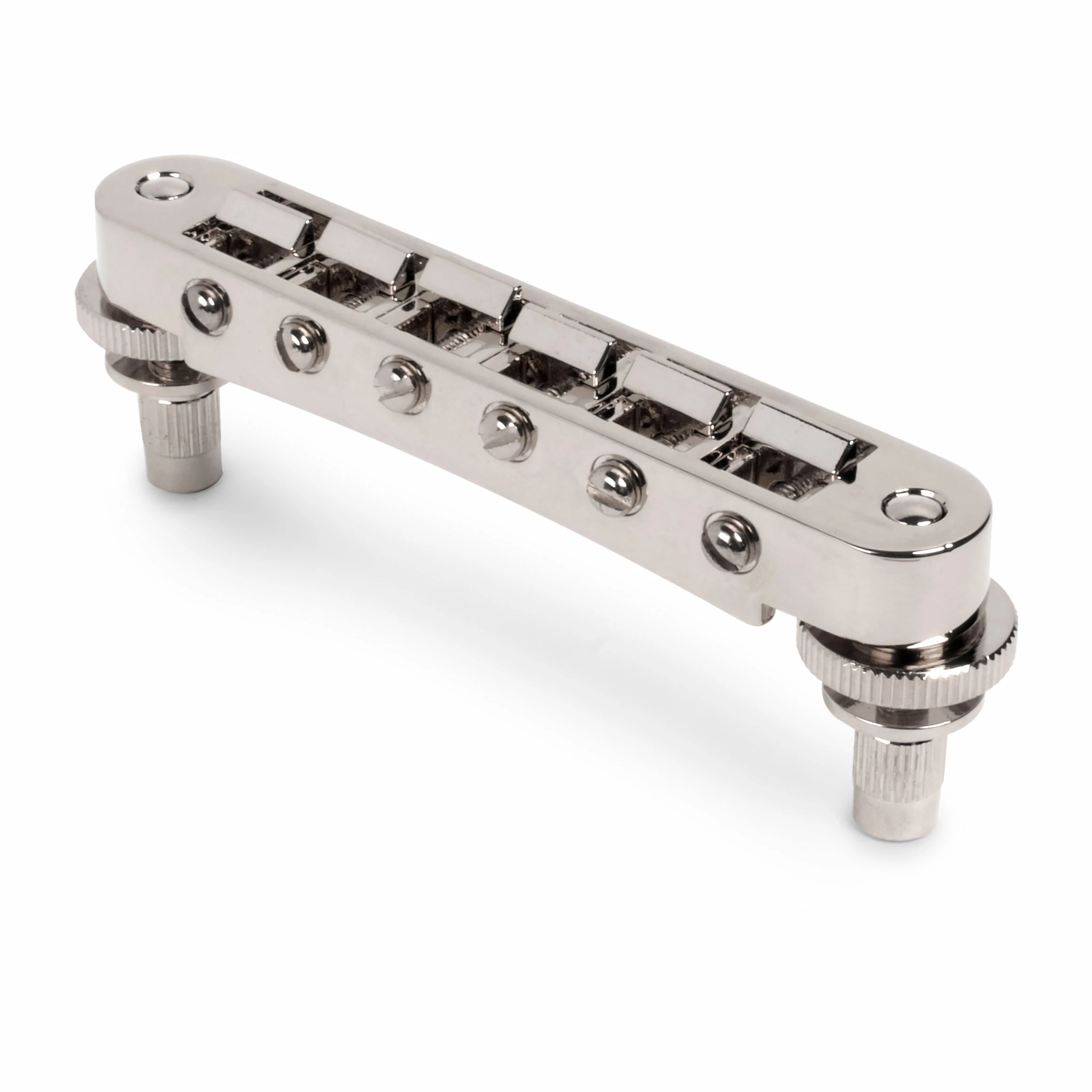 The adjustable bridge design found on current Gibson® solidbodies, with unnotched saddles with individual saddle screw retainer clips.
