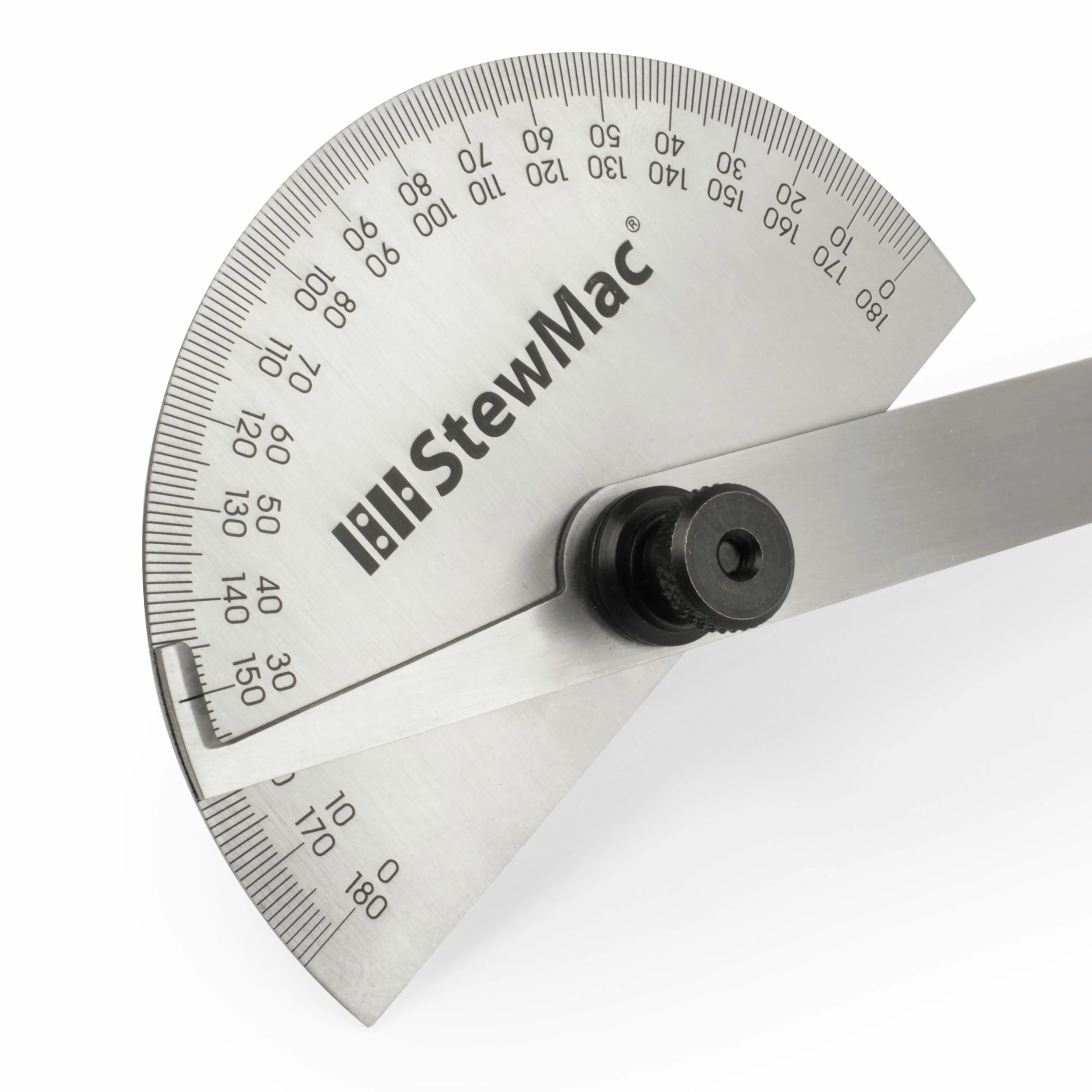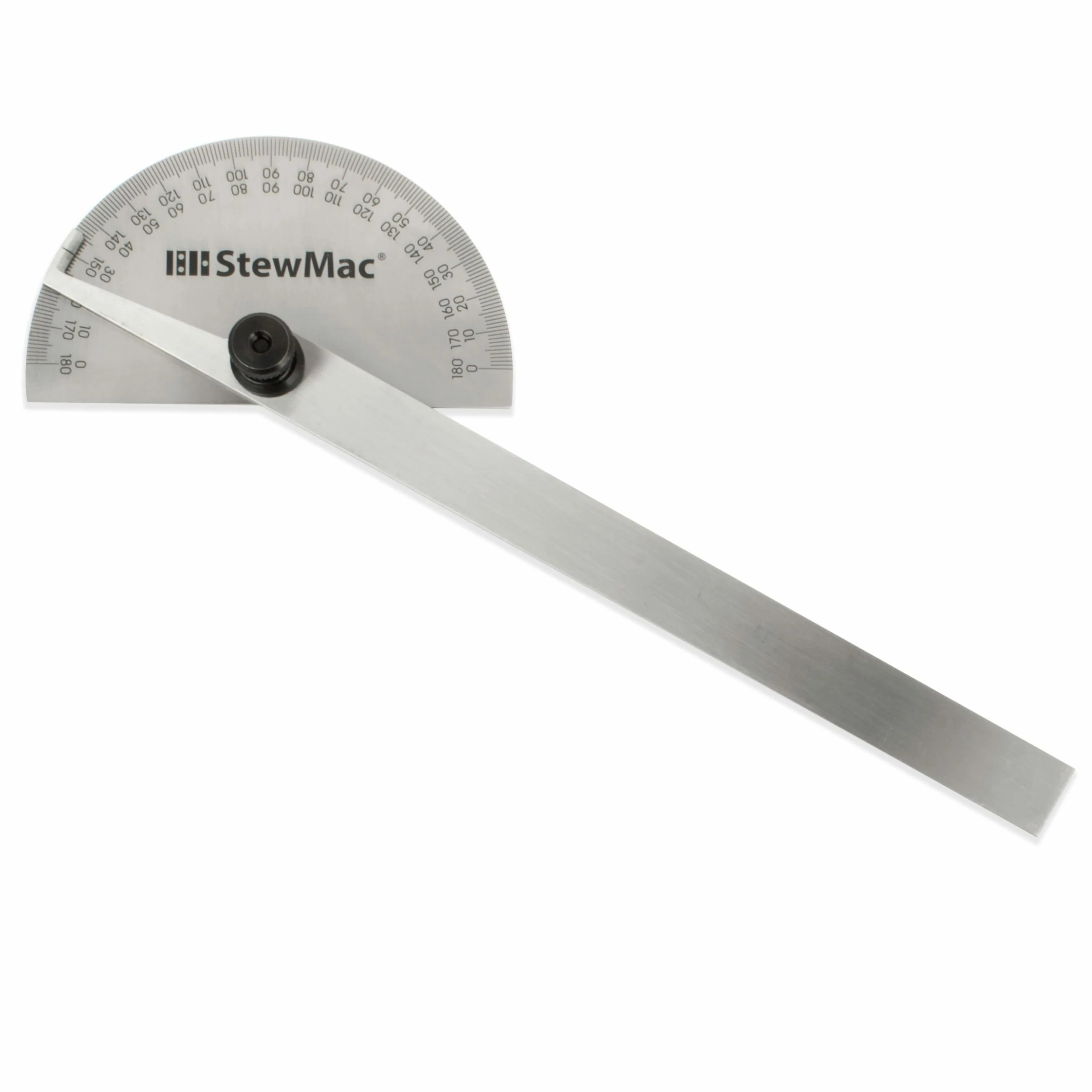Professional quality, round-head protractor to accurately gauge angles in guitar work: neck joint trajectories, peghead pitches, saddle slot angles and tool setup.